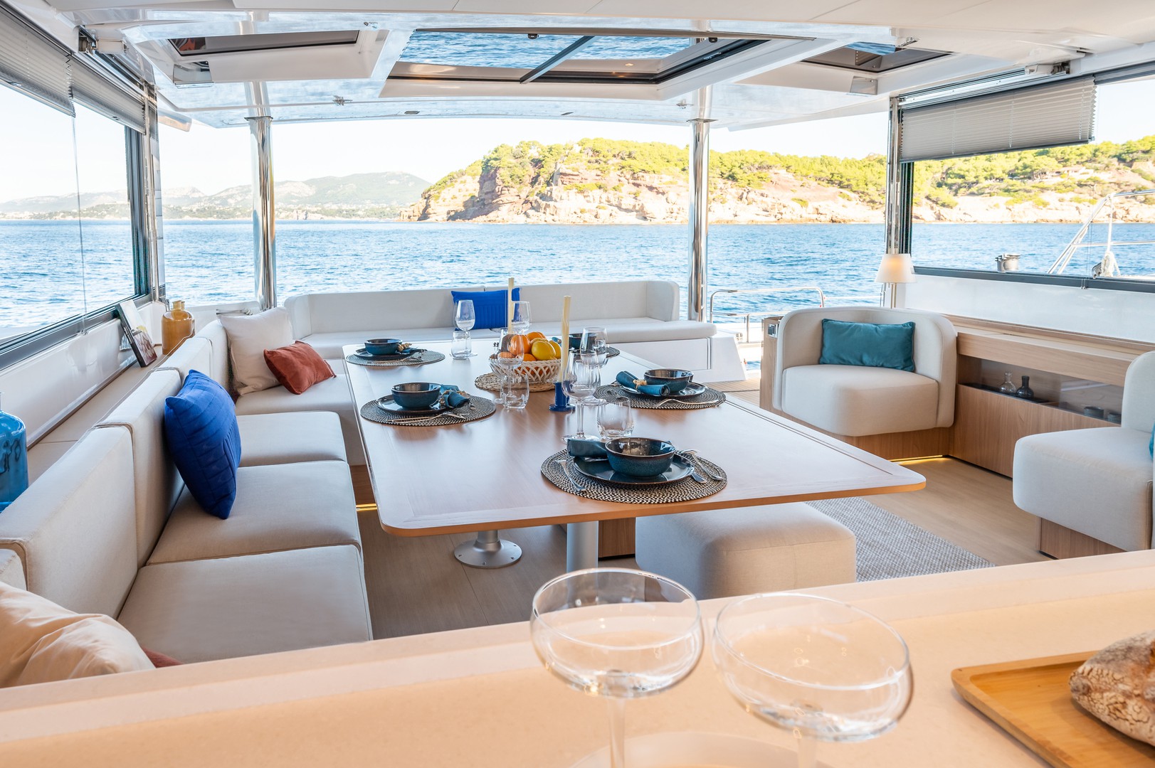 Hot water, Music system, Cutlery, Am/fm radio, Tv, Coffee machine, Dishwasher, Holding tank, Gas bottle, Gas stove, Socket 220v, Ice maker, Wine cellar, Inverter, All electric toilets, Microwaves-oven, Water skis, Club salon, Wifi, Box springs, A/c in cabins, Blackout blinds, Watermaker 240 l/h, American fridge (635 l) with cold water, ice maker and exclusive inverter.